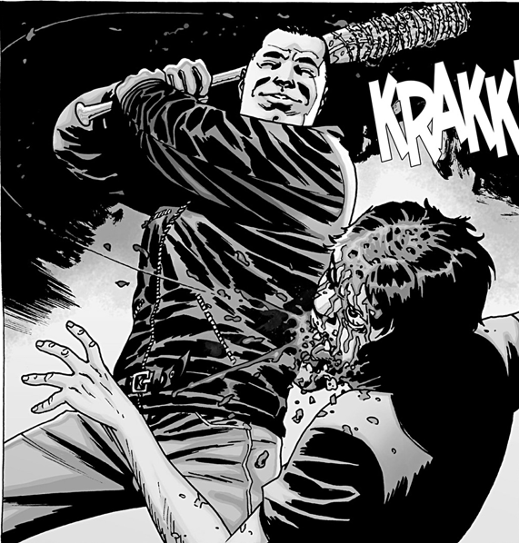 In the comics, Negan is the leader of a group called The Saviors. At one point in creator Robert Kirkman's stories, Rick Grimes and his group get captured by The Saviors, and Negan says he wants revenge for Saviors that were killed. He then beats Glenn to death with a baseball bat.